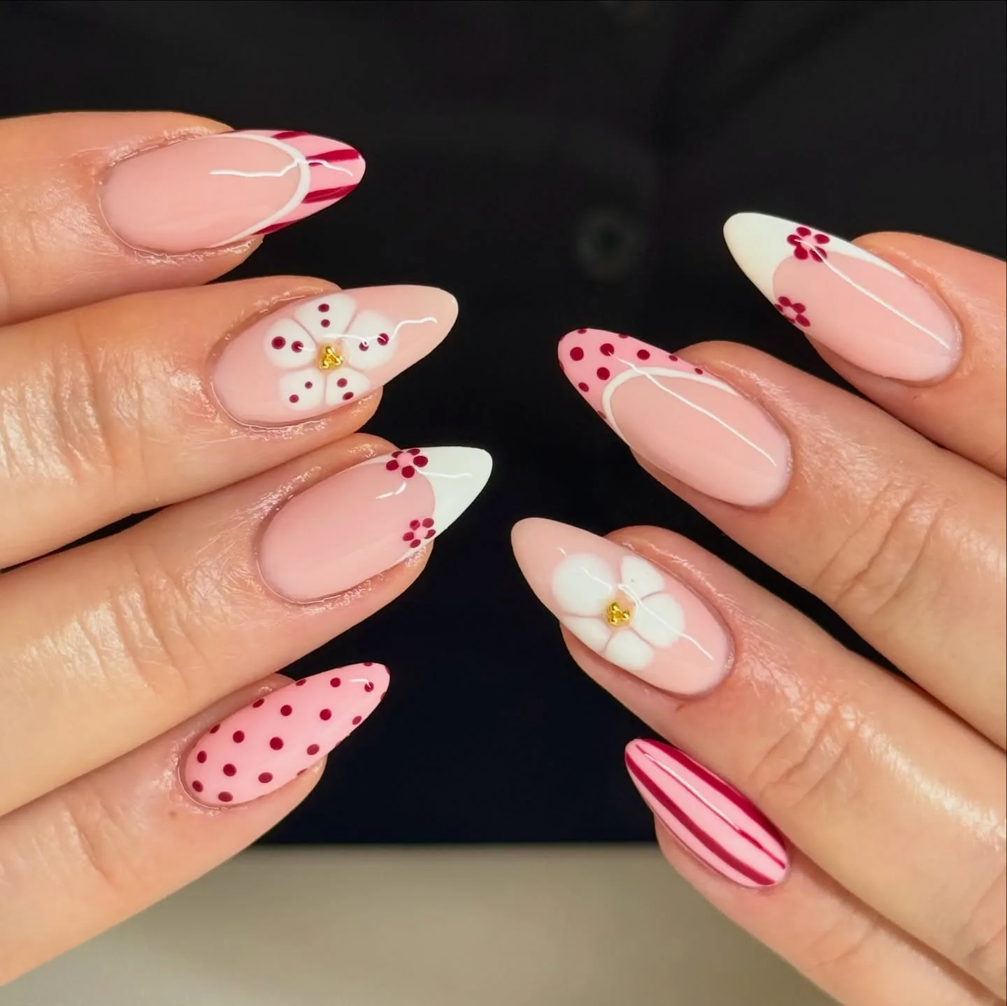 These almond-shaped nails feature a soft pink and white color palette with various romantic patterns including white flowers with gold centers, burgundy polka dots on pink base, burgundy and white stripes, and small burgundy floral accents. The cohesive Valentine’s Day inspired aesthetic is absolutely adorable! The glossy finish brings all these playful patterns together beautifully 💕
