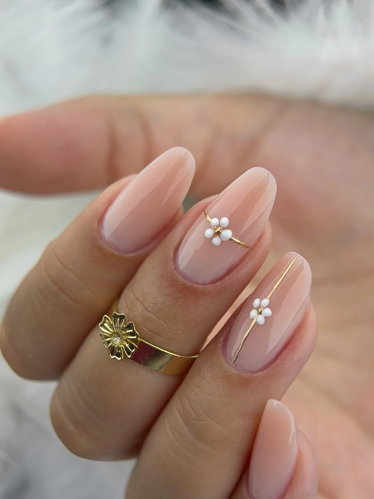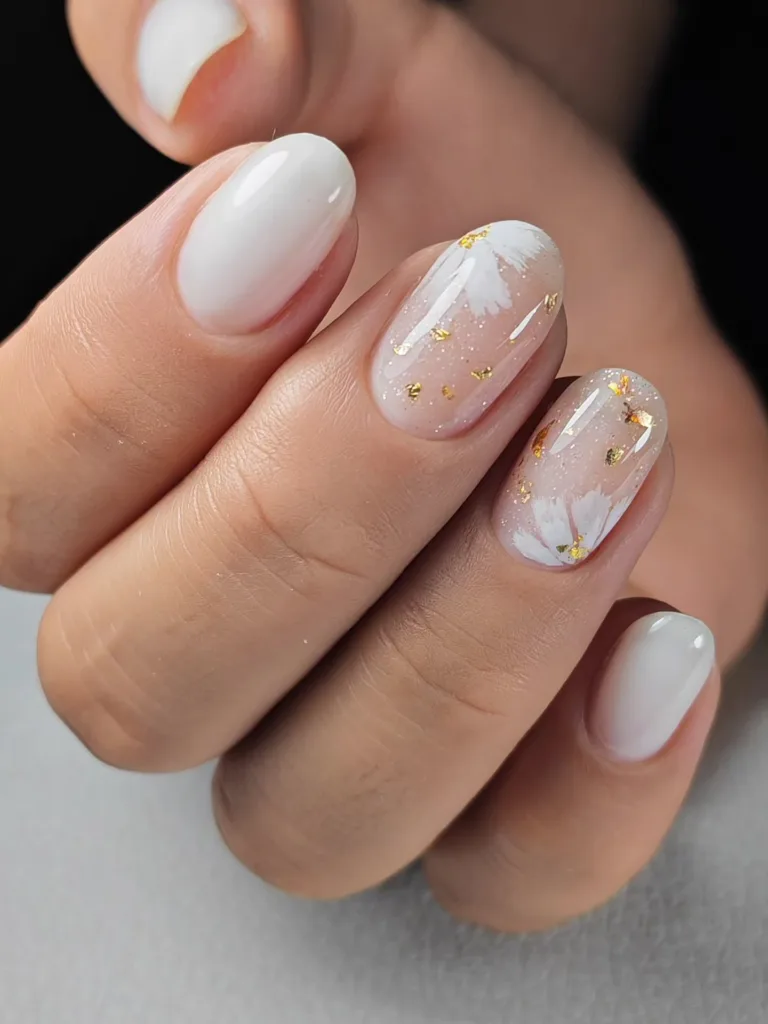 This sophisticated manicure features oval nails with a soft milky white base and glossy finish that’s absolutely dreamy! The accent nails showcase delicate white floral designs with golden foil accents scattered throughout, creating an elegant pressed flower effect. The romantic and ethereal quality makes this design perfect for special occasions ✨