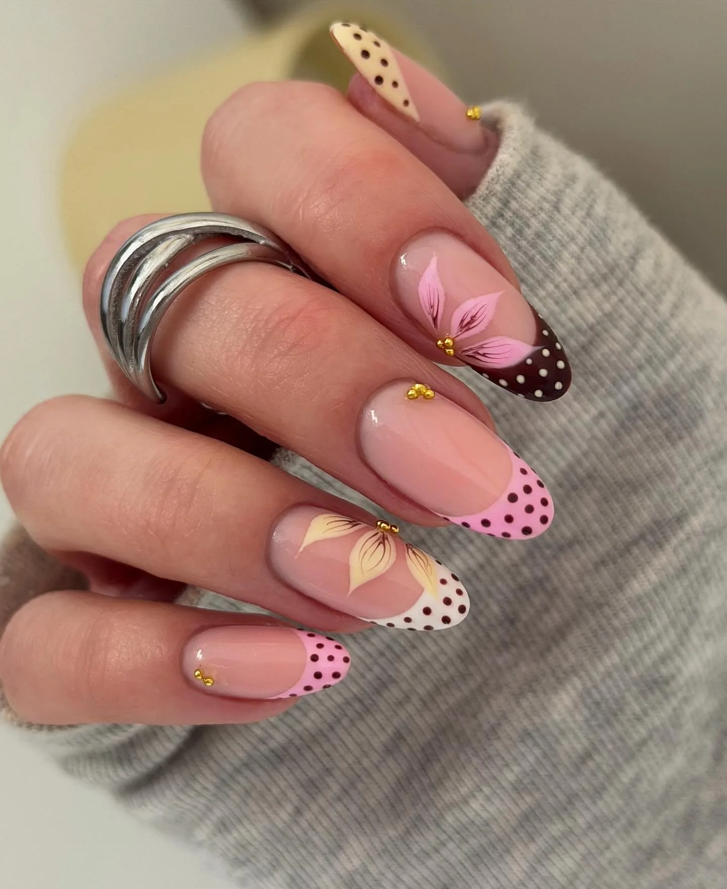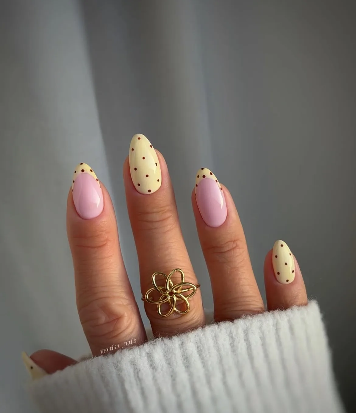 These adorable almond-shaped nails alternate between soft pink and cream bases, both decorated with small brown and dark red polka dots scattered playfully across the surface. The glossy finish gives them such a vintage-inspired charm that’s totally irresistible! Paired with that delicate gold flower ring and cozy white knit, this look screams retro chic 🌼