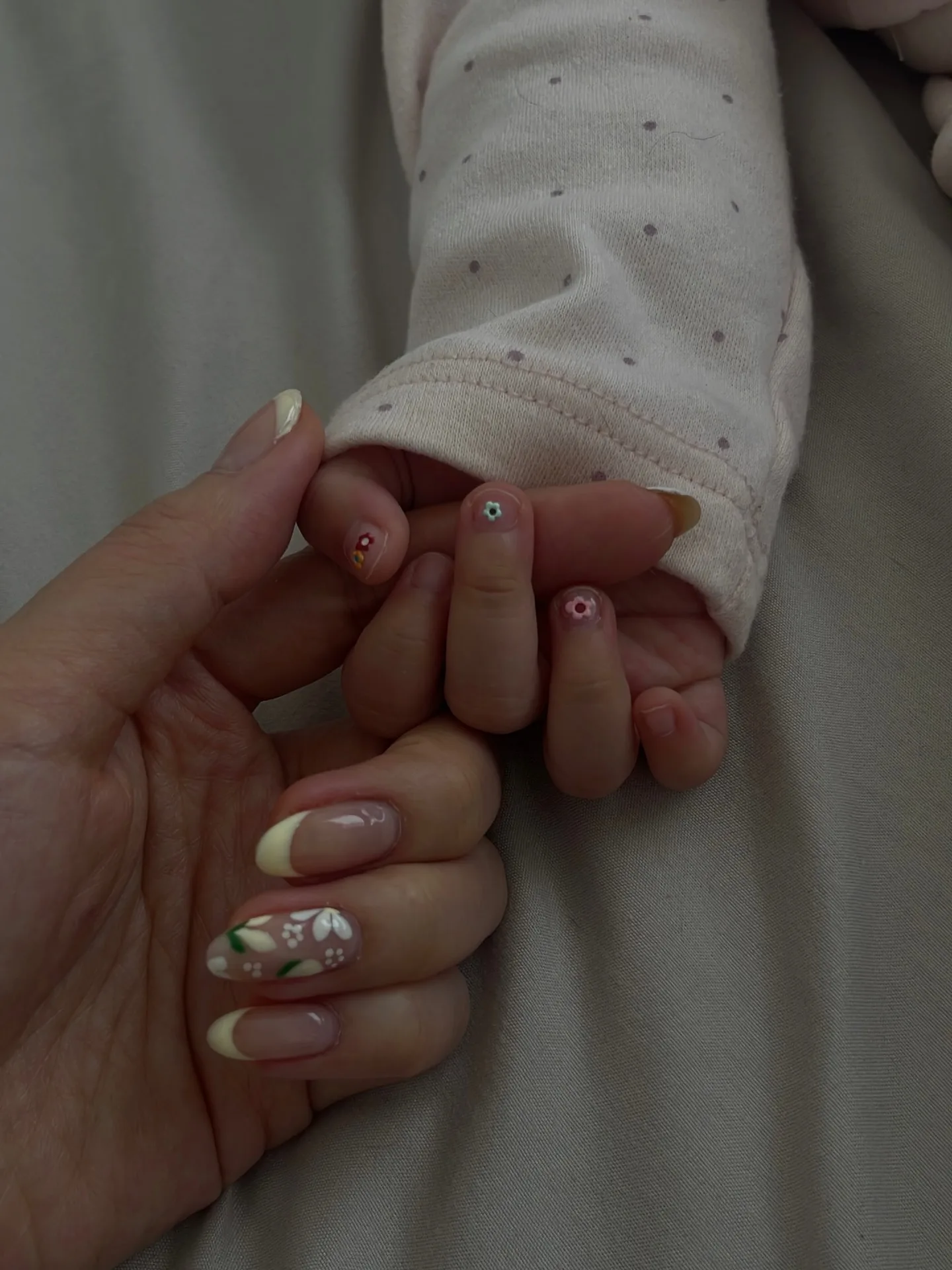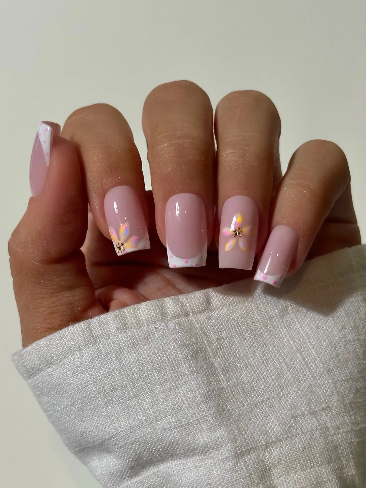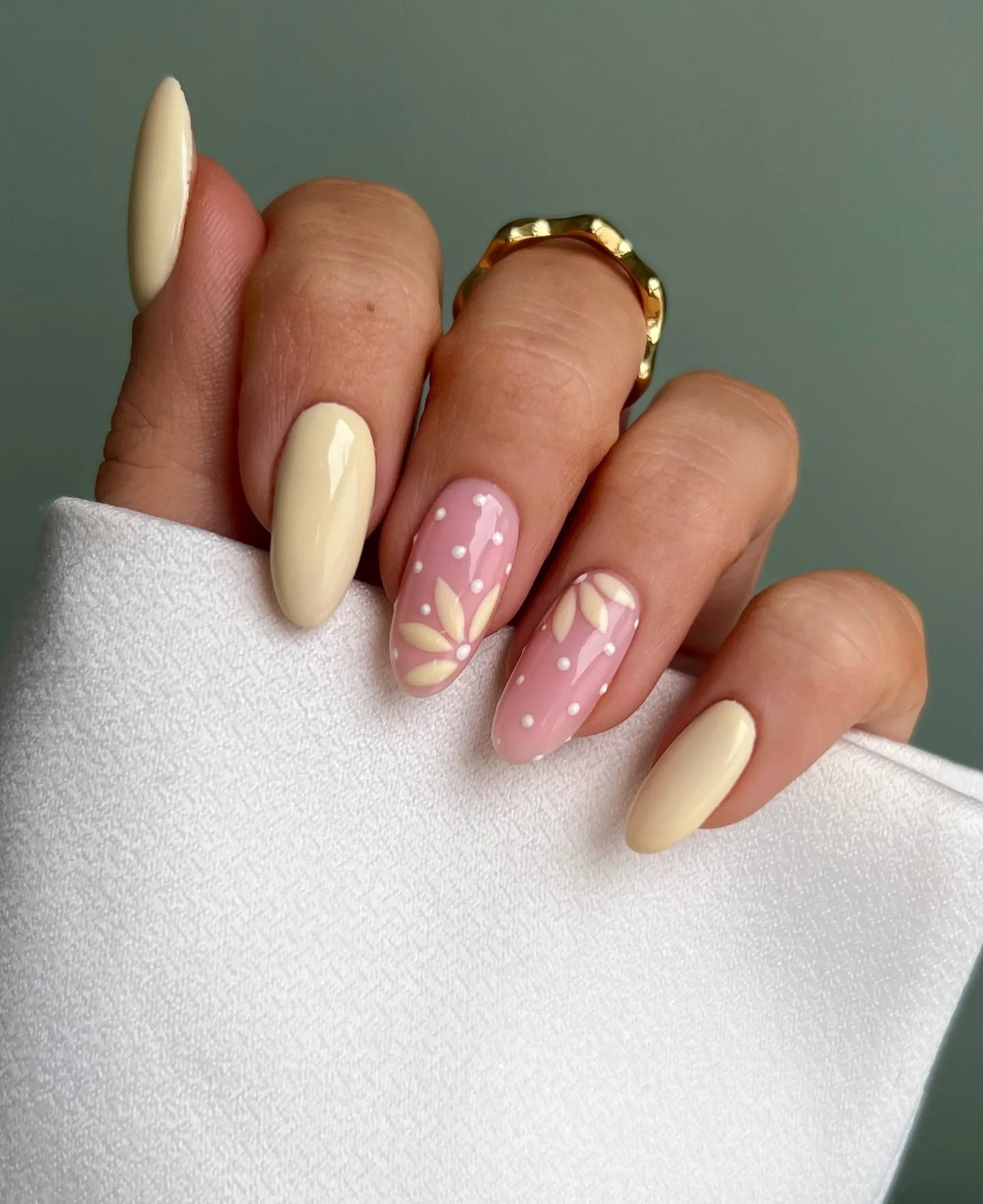 This elegant design alternates between creamy vanilla butter yellow nails and dusty rose pink nails decorated with white polka dots and delicate cream-colored daisy flowers. The glossy finish creates such a sophisticated yet playful romantic vibe that’s perfect for spring! The soft color palette is absolutely dreamy 🌼