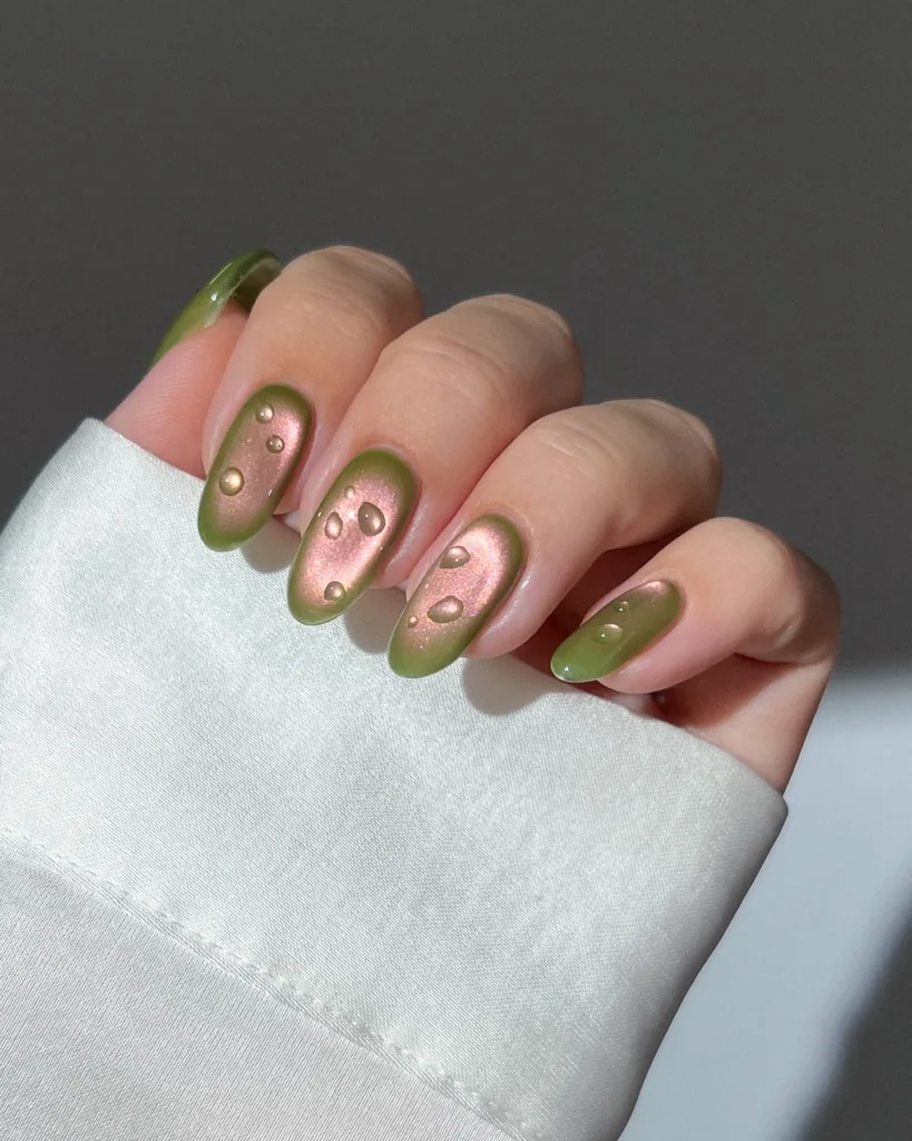 These stunning almond-shaped nails combine a rich olive green jelly base with a mesmerizing rose gold aurora shimmer at the center of each nail. The raised 3D golden droplet accents scattered across the surface create a dewy, otherworldly texture that looks like morning dew on fresh leaves. This one-of-a-kind spring design is giving major garden fairy energy and we absolutely cannot get enough! 🌿