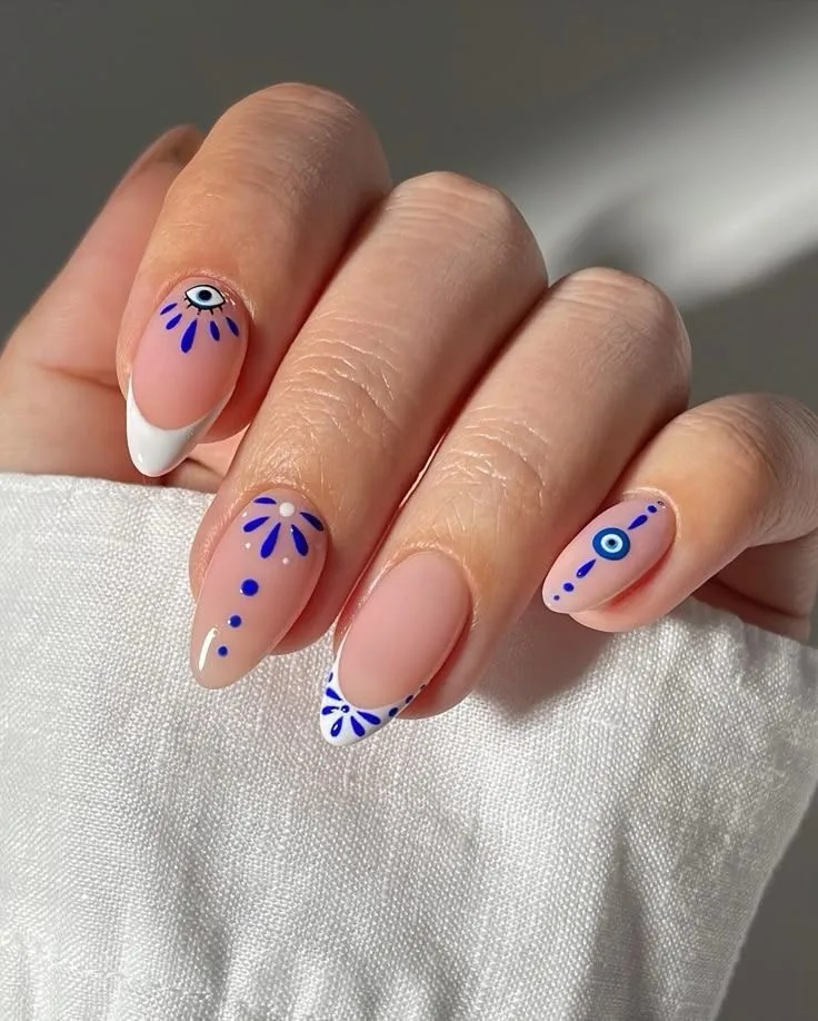 These almond-shaped nails showcase a clean nude base with vibrant cobalt blue evil eye motifs, decorative dots, and small floral burst designs scattered asymmetrically across different nails. The mystical Mediterranean-inspired evil eye theme against the minimalist base creates such a trendy, protective vibe! The glossy finish makes the blue details absolutely pop 🧿