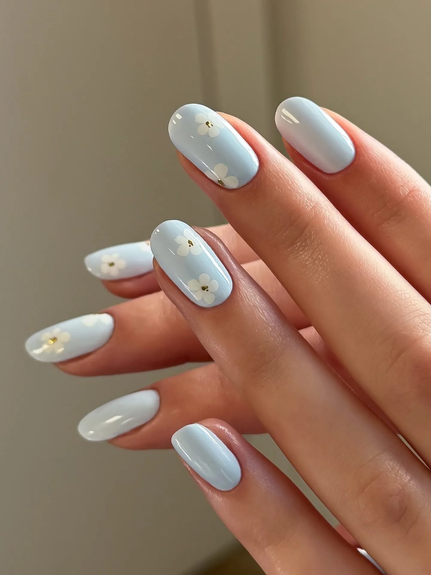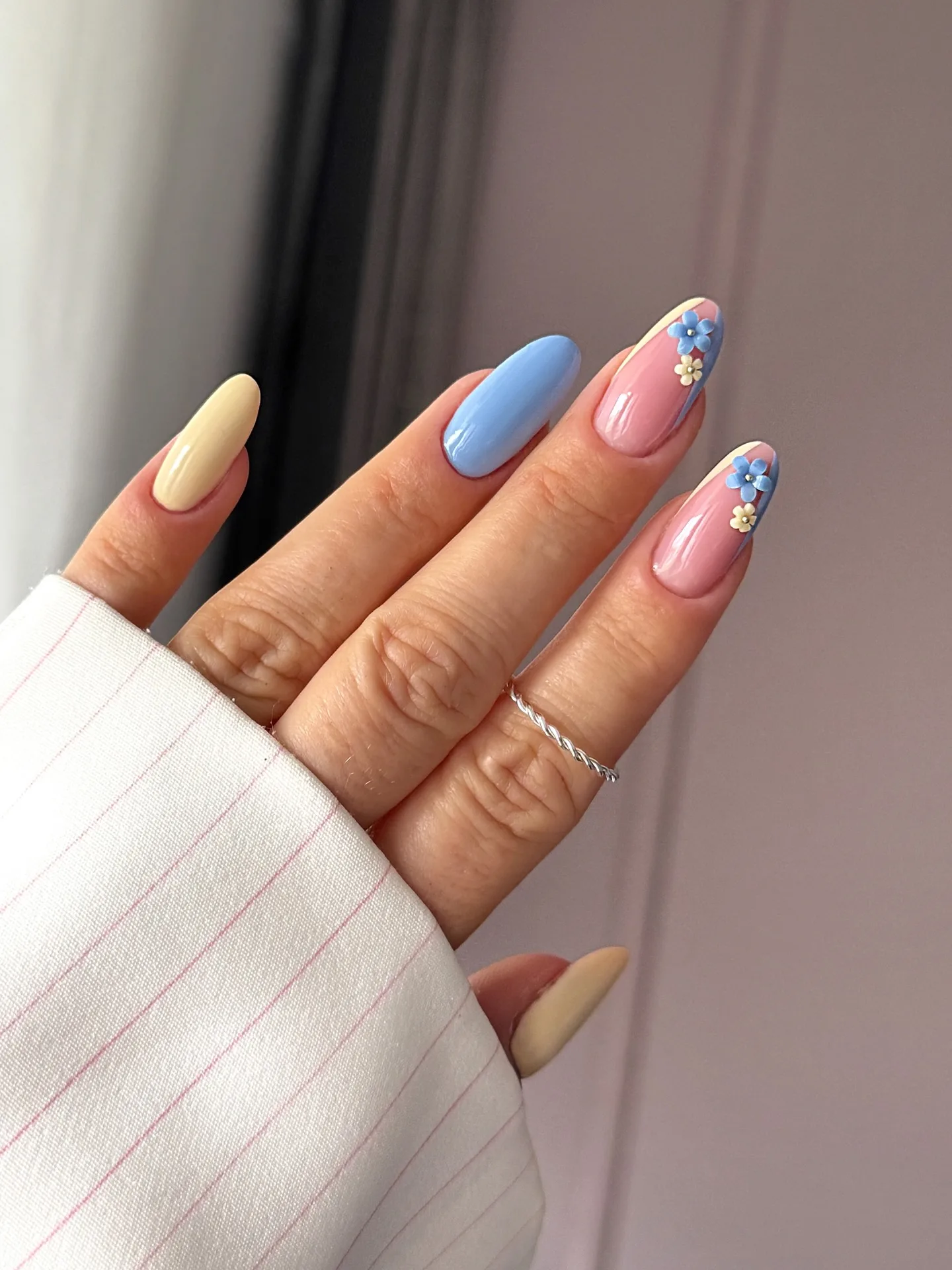 This dreamy manicure showcases medium-length oval nails in the sweetest pastel palette with pale yellow, periwinkle blue, and soft coral pink bases. The delicate 3D flower embellishments in blue and white with tiny pearl centers on the ring and pinky nails add such a romantic spring touch! The glossy finish makes these feminine florals absolutely luminous 🌸