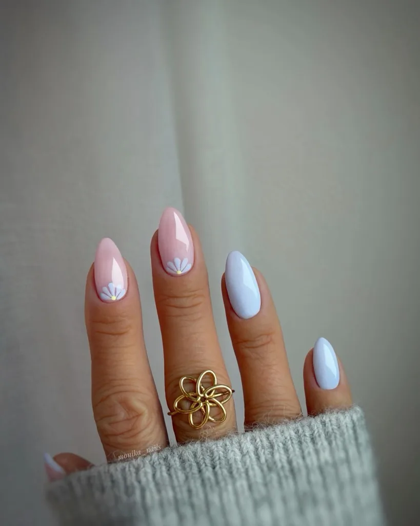 These almond-shaped nails feature a soft dusty pink base on the index and middle fingers with delicate baby blue line art resembling minimalist leaf or petal designs near the cuticle area. The ring and pinky fingers are painted in clean baby blue for perfect balance! The elegant and minimalist aesthetic with romantic spring vibes is absolutely gorgeous 🌸