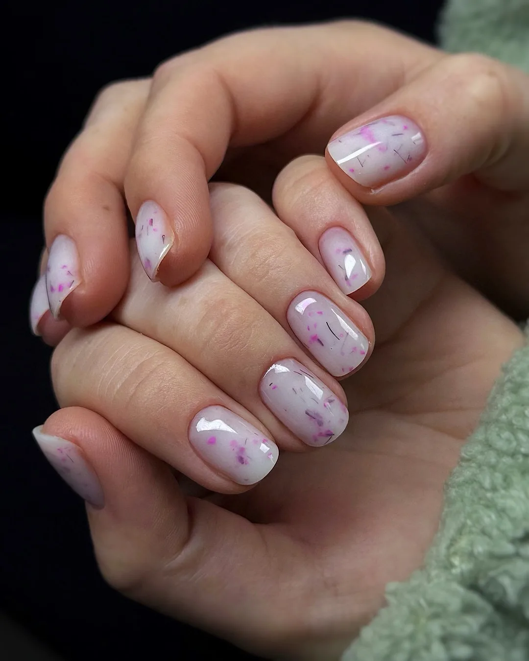 These squoval nails feature a translucent milky white base with delicate purple and magenta dried flower petals embedded within the polish, creating an organic pressed-flower effect. The romantic and ethereal vibe with this modern twist on floral nail art is absolutely stunning! The glossy finish makes the embedded petals look like precious botanical specimens ✨