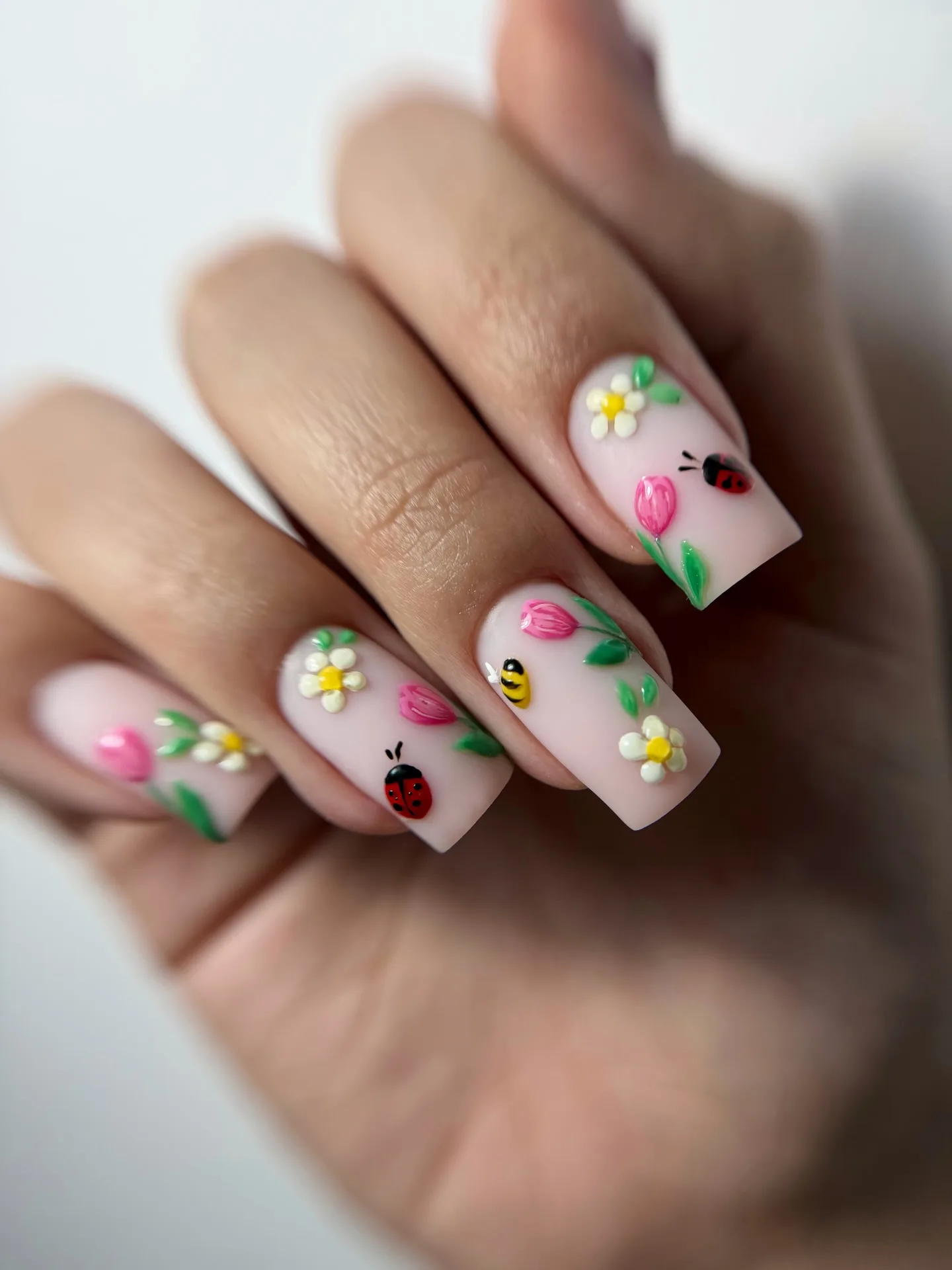 These coffin-shaped beauties feature a soft pink base covered in the most adorable 3D elements including white daisies with yellow centers, pink tulips with green leaves, cute ladybugs, and yellow bees! The dimensional floral and insect motifs create such a whimsical spring garden theme that’s absolutely charming. The glossy finish makes every tiny detail pop perfectly 🐝