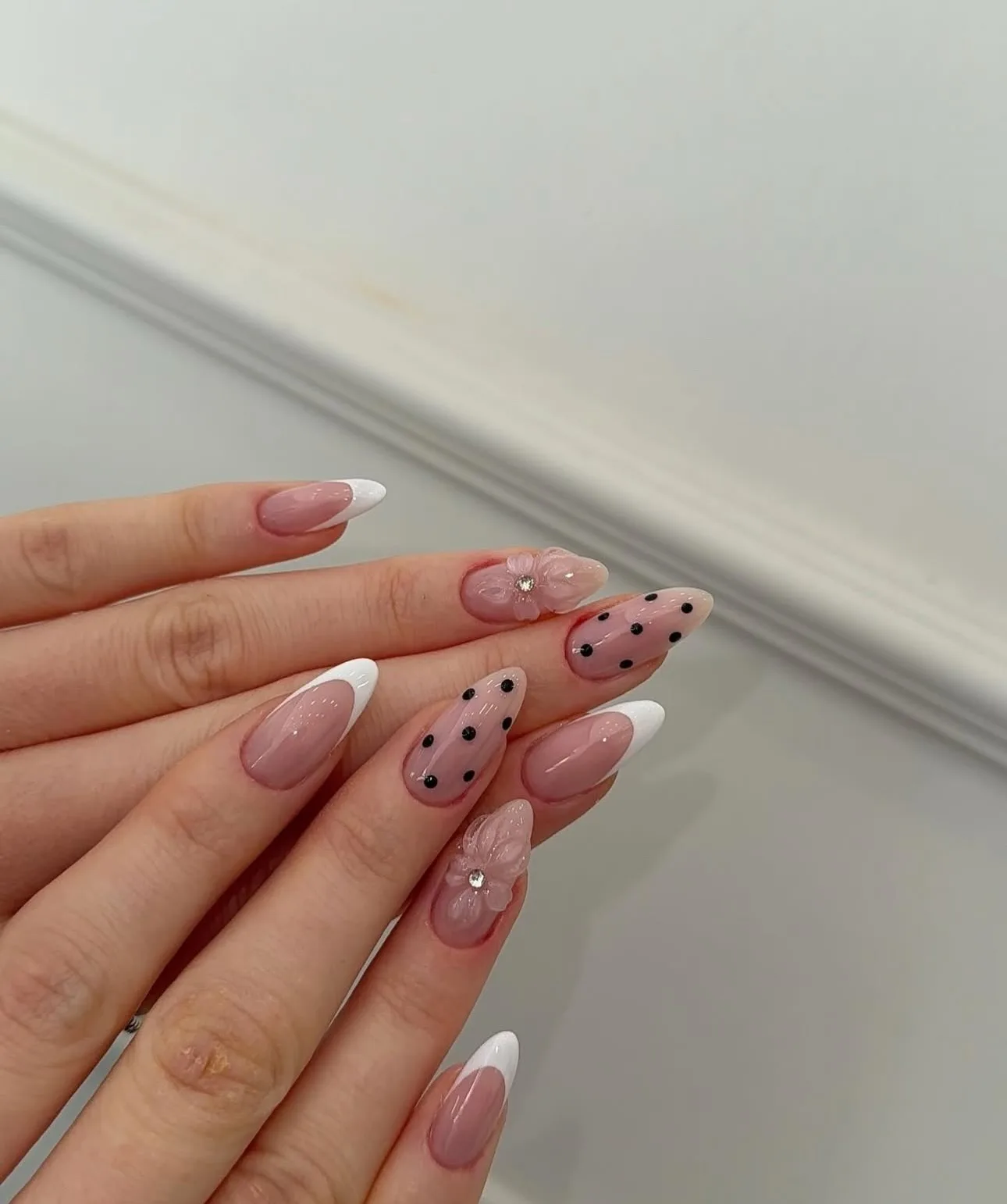 These almond-shaped nails showcase a nude pink base with white French tips on most nails, while two stunning accent nails feature black polka dots over the nude base. One nail even has a small rhinestone embellishment for extra sparkle! The elegant and minimalist design with that playful polka dot twist is absolutely perfect ✨