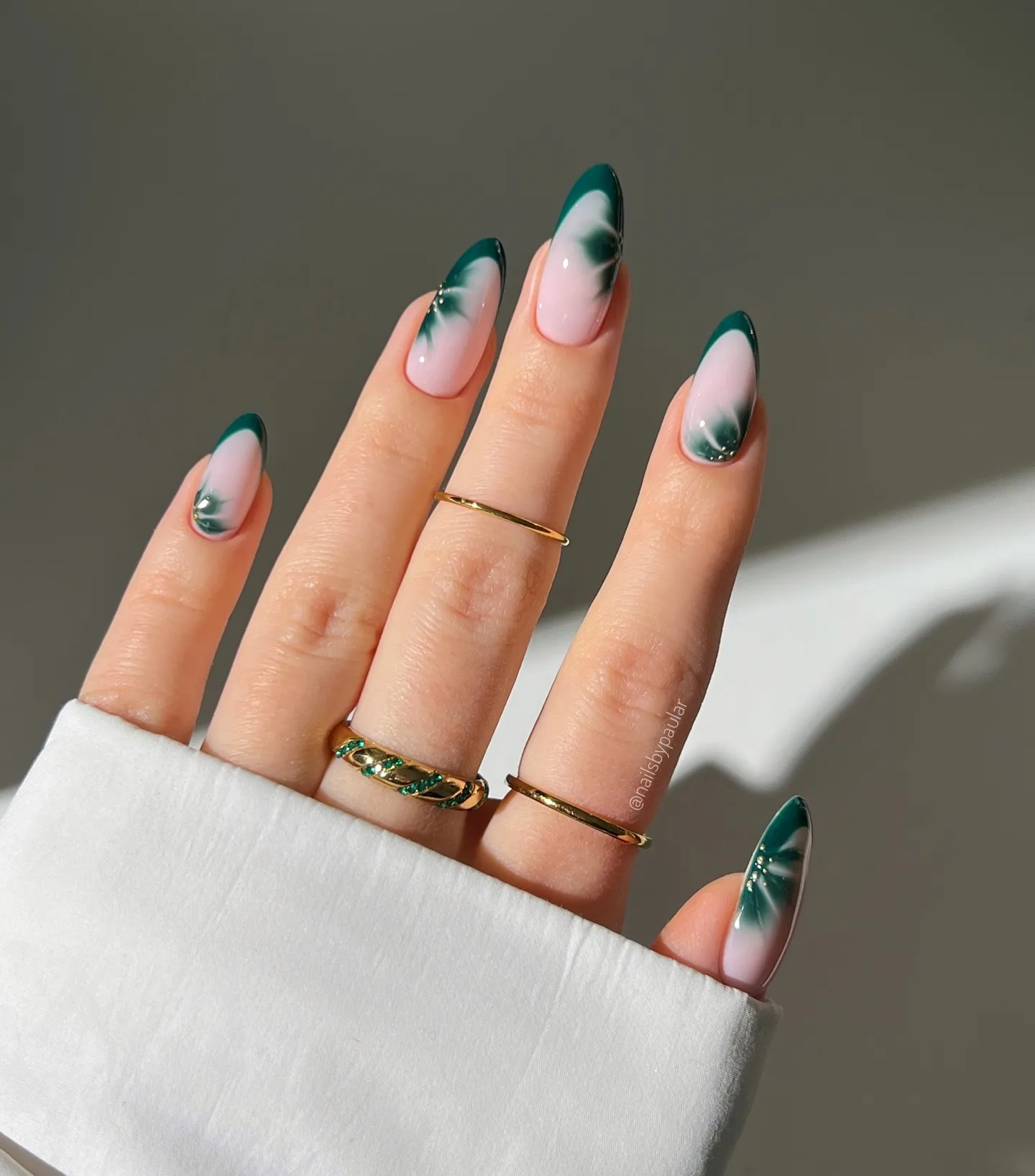 These gorgeous almond-shaped nails feature the most stunning emerald green French tip design over a sheer pink base! The deep forest green tips blend seamlessly into translucent pink with a gorgeous gradient effect that looks absolutely sophisticated. The glossy finish paired with delicate gold rings creates such an elegant, luxurious vibe ✨