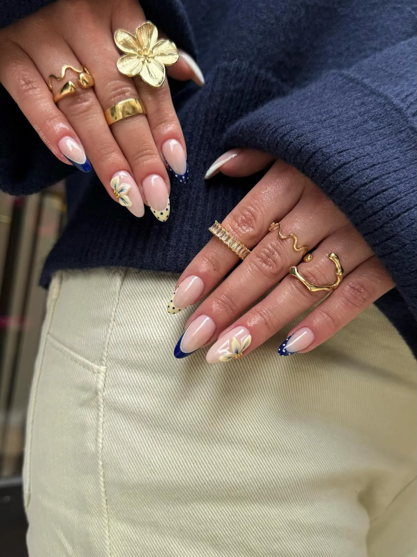 These almond-shaped nails feature a nude pink base with chic navy blue French tips decorated with white polka dots that look absolutely stunning! The delicate white floral designs on accent nails add such a feminine touch to this playful twist on the classic French manicure. The elegant combination styled with gold rings creates the perfect sophisticated look ✨
