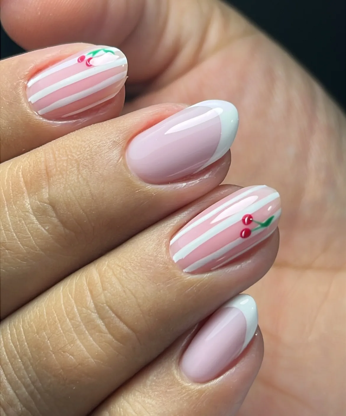 This adorable design alternates between solid pale pink nails and striped accent nails with white and pink horizontal stripes, decorated with small red cherry details and green leaves. The playful and sweet cherry theme is absolutely perfect for spring! If you love cherry nail designs, this glossy finish makes every detail look fresh and delicious 🍒