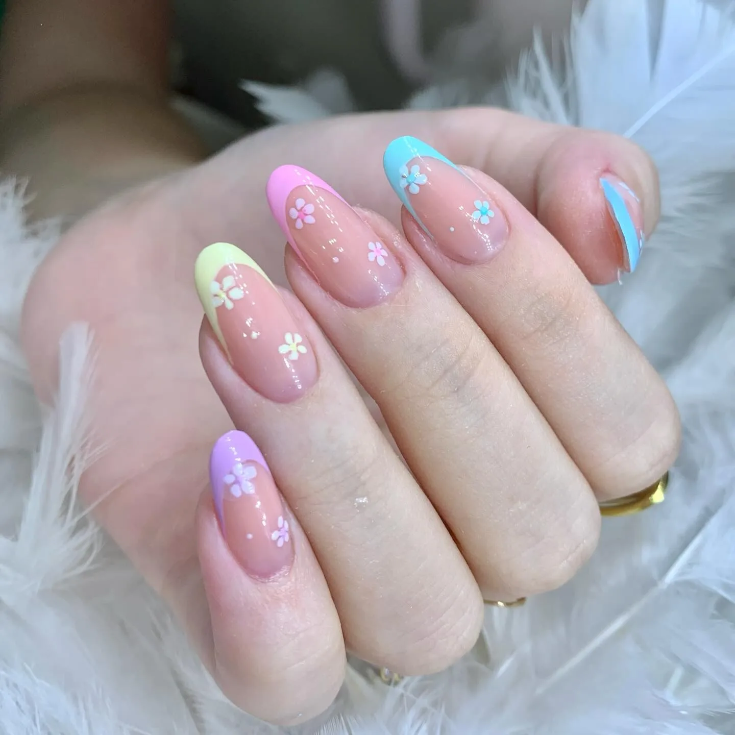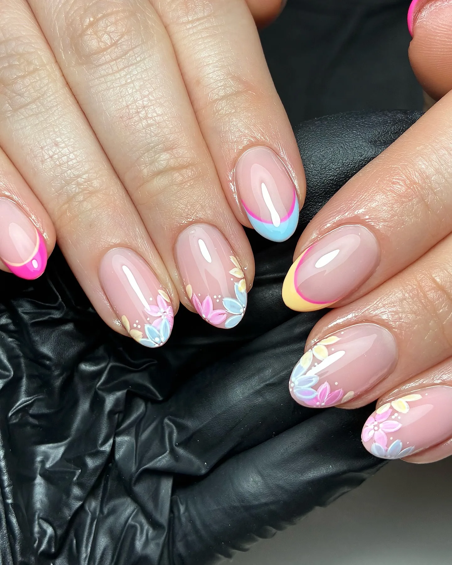 This vibrant manicure features oval nails with a clear base and multicolored French tips in hot pink, bright yellow, and sky blue that are absolutely stunning! The delicate hand-painted floral details with pink and blue petals, white dots, and gold accent lines create such a playful spring vibe. This modern twist on the classic French manicure is pure perfection 🌈