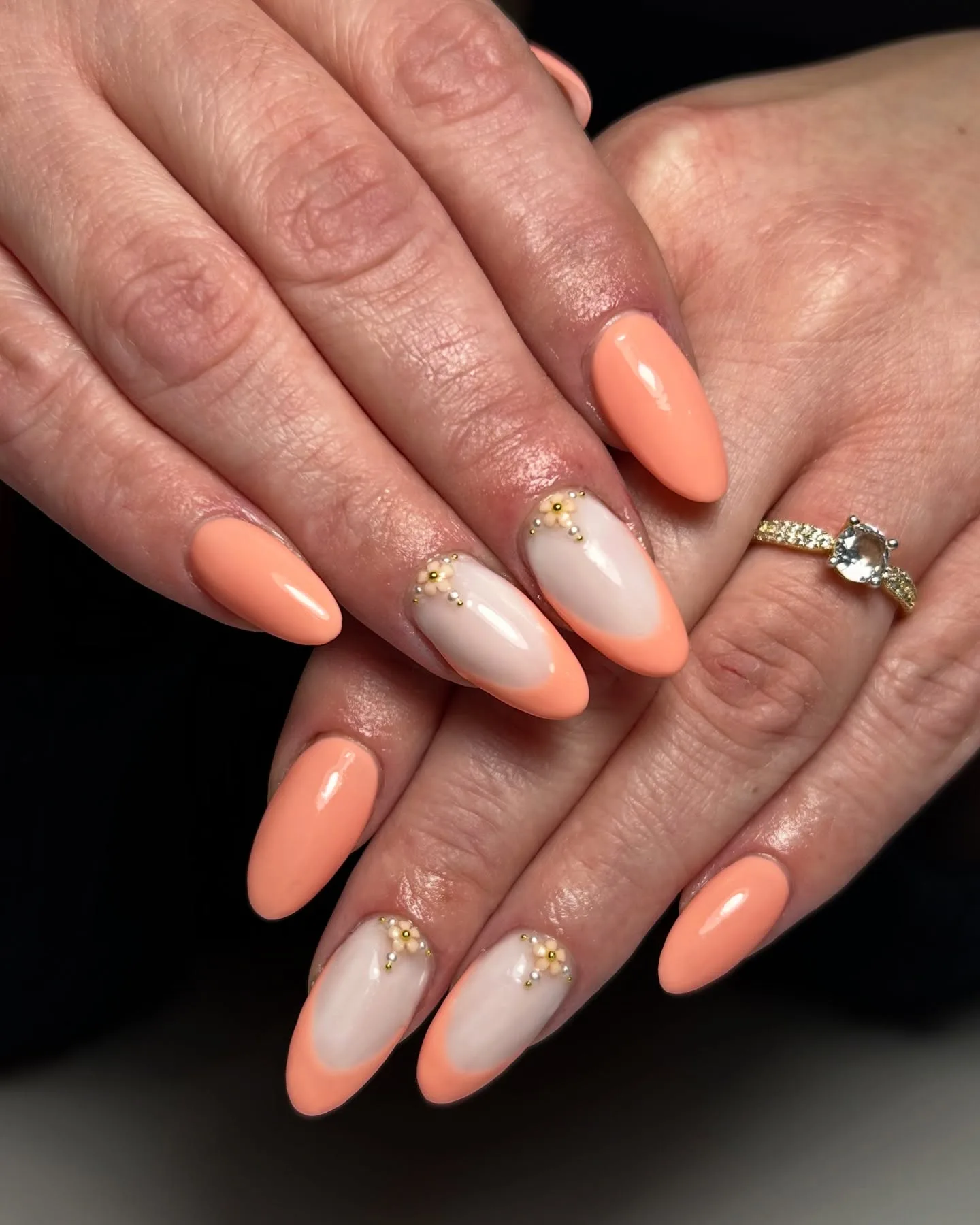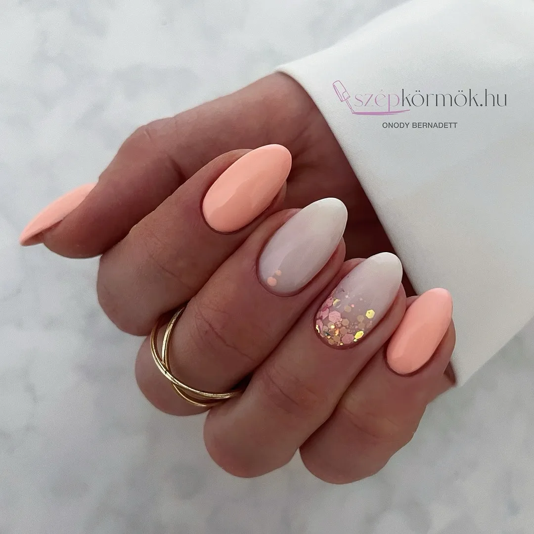 These almond-shaped nails are absolutely stunning with their soft peachy-coral and nude pink color-blocking design! The glossy finish enhances the subtle ombré effect beautifully. Paired with those delicate gold rings, this minimalist yet sophisticated look is pure perfection for spring ✨