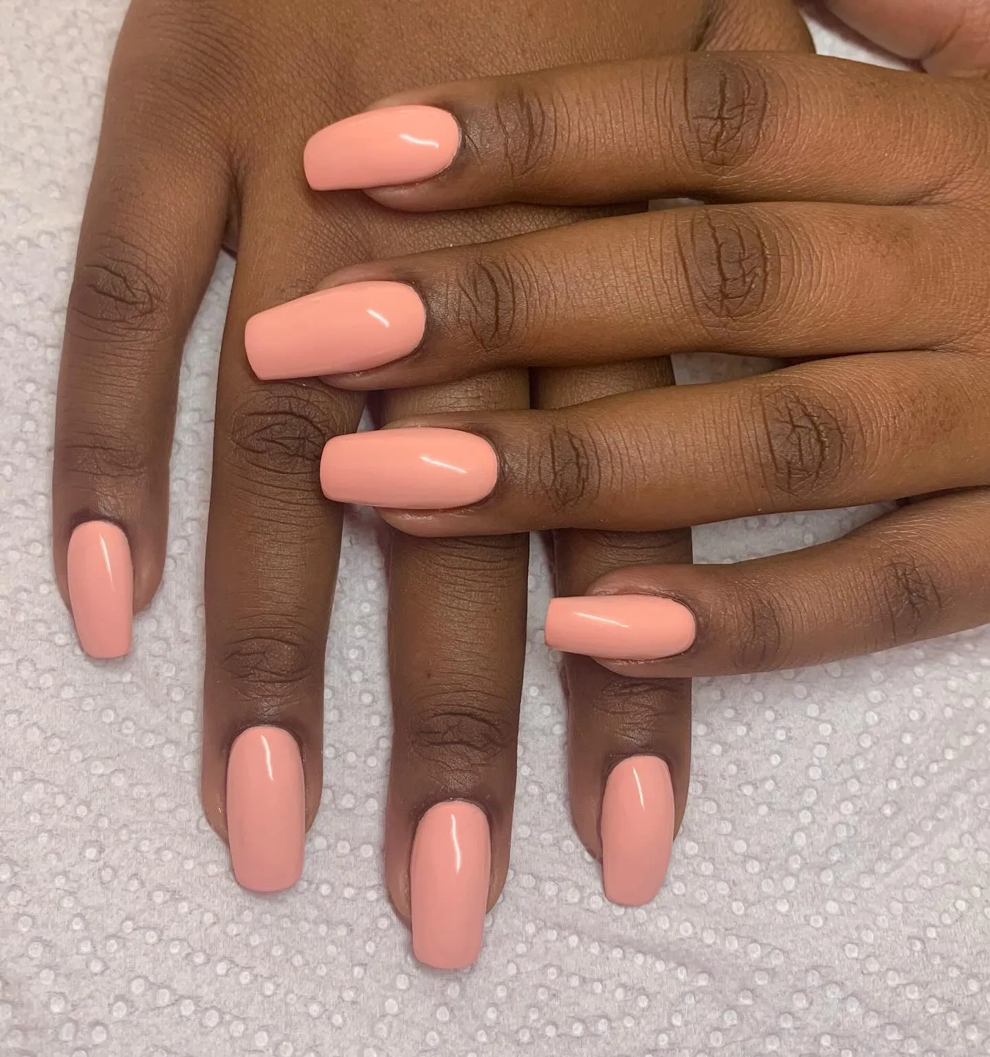 These medium-length oval nails in soft coral pink are the definition of effortless elegance! The clean, even application and glossy finish create such a polished, professional look. This classic solid color manicure proves that sometimes the most beautiful peach nail designs are the most timeless ones 💅