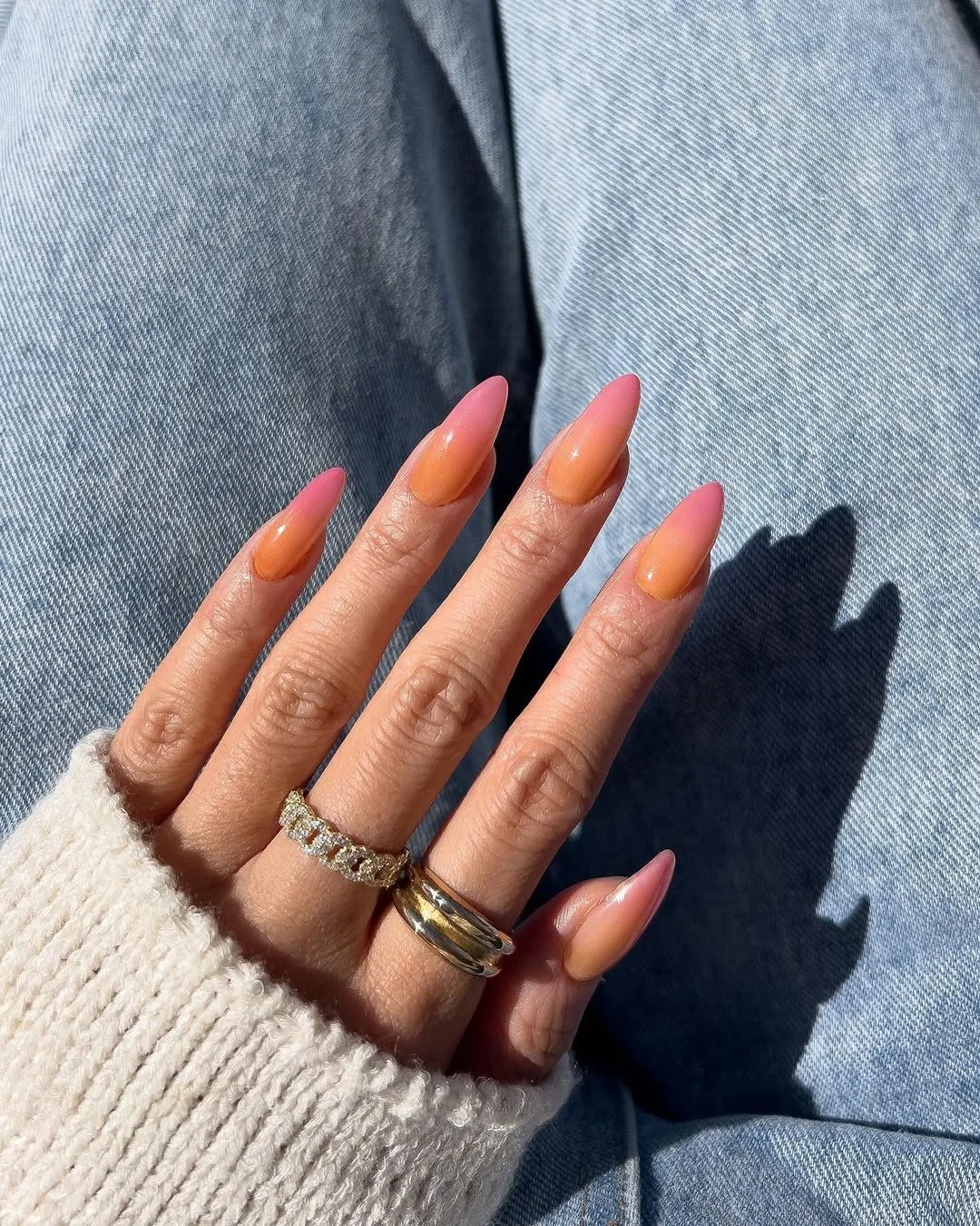 These almond-shaped nails are giving us major sunset vibes with their stunning peachy-coral to soft pink gradient! The glossy, glazed finish creates that coveted jelly-like appearance that’s so on-trend right now. This ethereal color transition is absolutely perfect for channeling those warm spring evenings 🌅