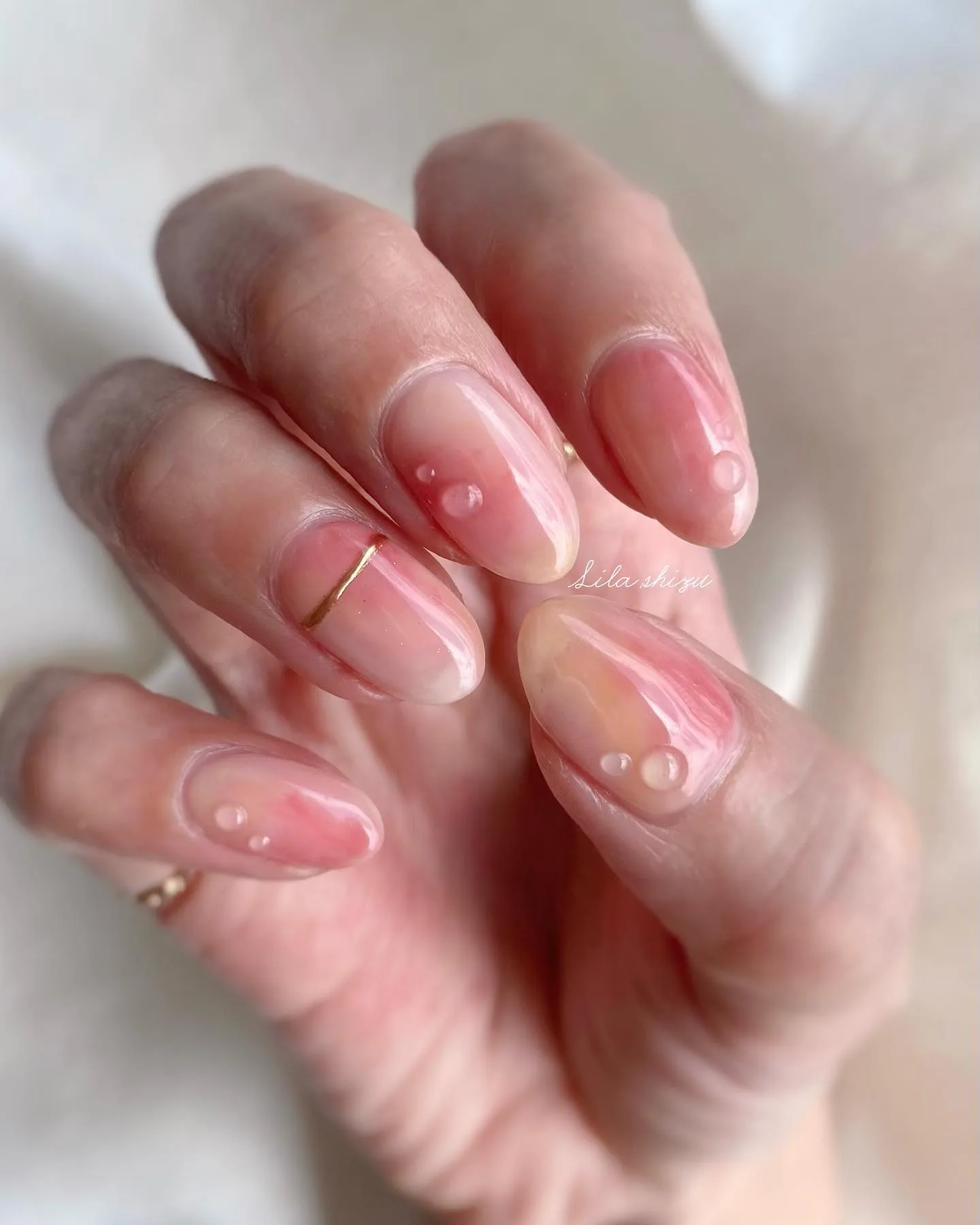 These oval nails are pure dreamy perfection with their translucent jelly pink finish that creates a glass-like appearance! The minimal white pearl dots and thin gold foil striping add such delicate, sophisticated touches. This soft, romantic aesthetic is exactly what we need for those spring nail trends we’ve been following 💎