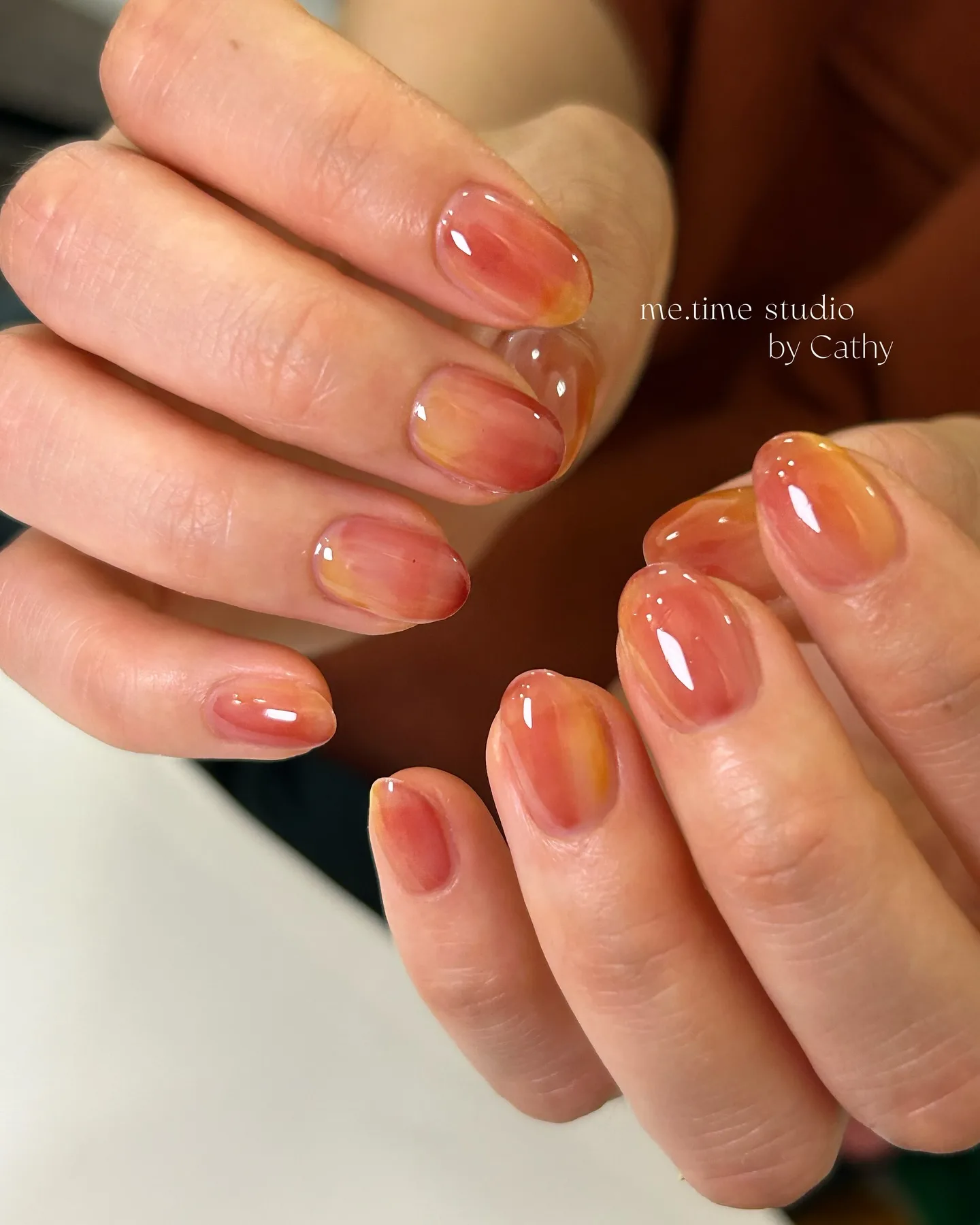These medium-short oval nails are serving up serious glazed donut nail energy with their translucent jelly finish! The peachy-coral and orange gradient tones blend so seamlessly, creating that coveted glass-like, luminous effect. This modern glazed aesthetic in sunset-inspired hues is absolutely mesmerizing ✨