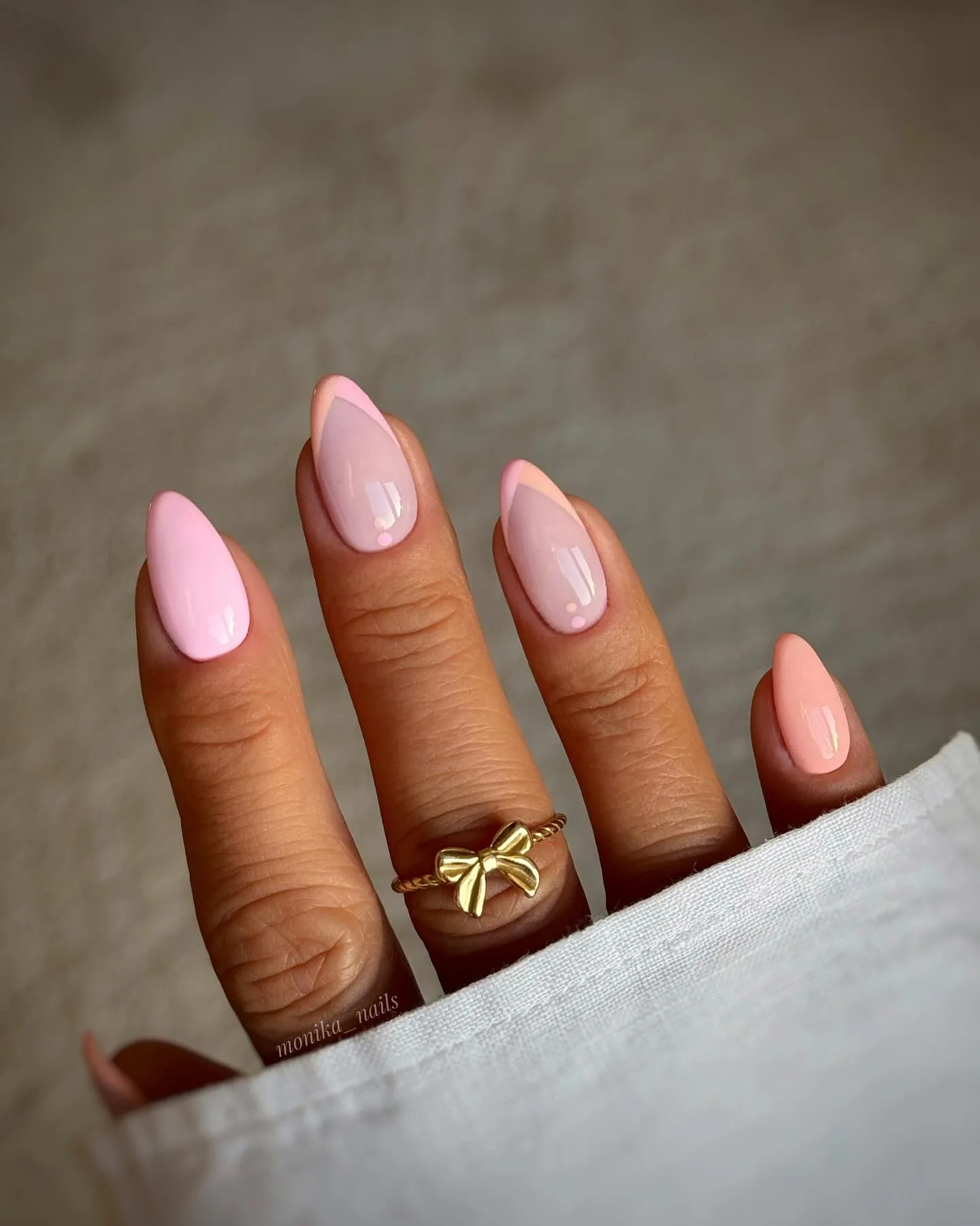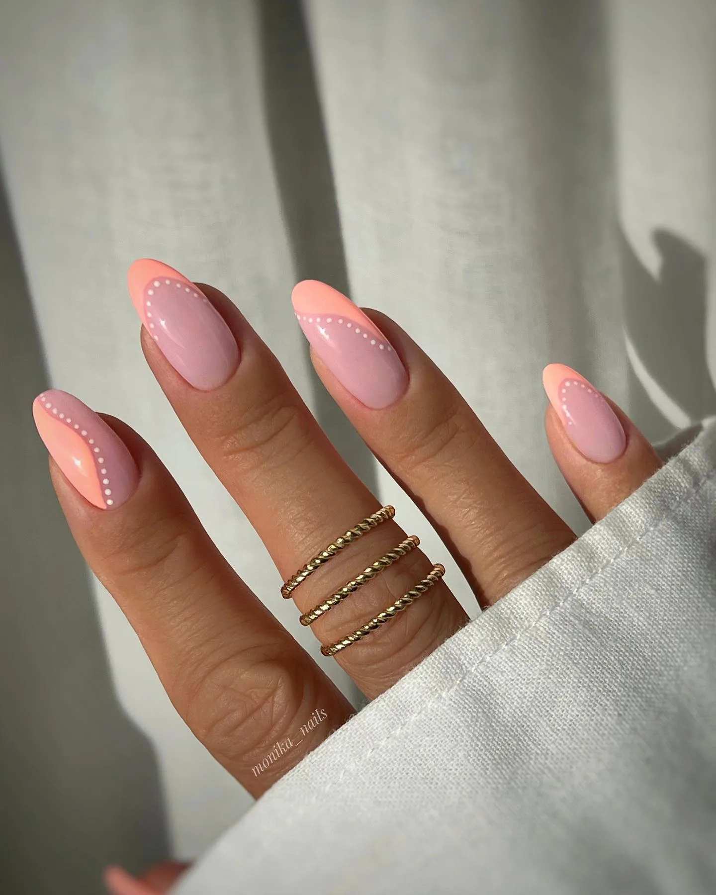 These almond nails are putting a fresh spin on the classic French manicure! The soft pink base with coral-peach tips and delicate white dotted details along the cuticle area create such a modern, elegant look. This contemporary take on nail art trends 2026 is absolutely gorgeous with those gold twisted rings 🤍