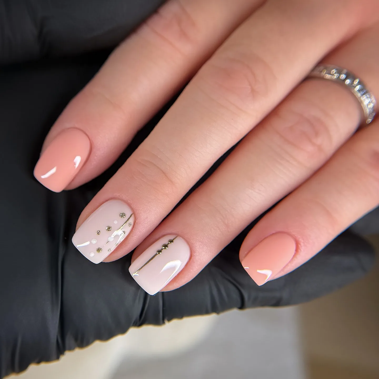 This sophisticated squoval manicure is serving up serious elegance with its dusty rose and peachy nude palette! The two accent nails with delicate gold studs and rhinestone embellishments create such beautiful, refined details. This minimalist yet polished look is perfect for anyone who loves subtle luxury 💎