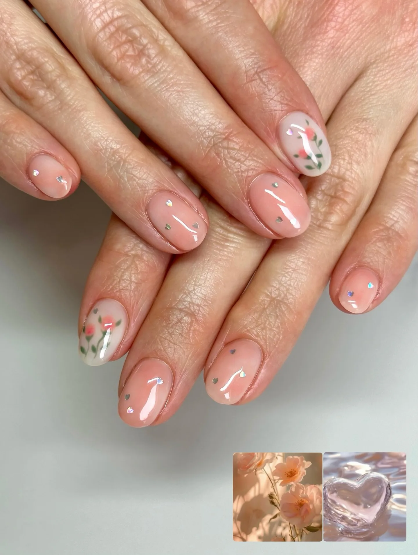 Talk about romantic spring vibes! These short oval nails feature a warm peachy-pink base with the most adorable scattered gems and rhinestones. The real showstoppers are those two accent nails with sheer white bases and hand-painted coral-pink flowers with green leaves that scream spring garden party! 🌸