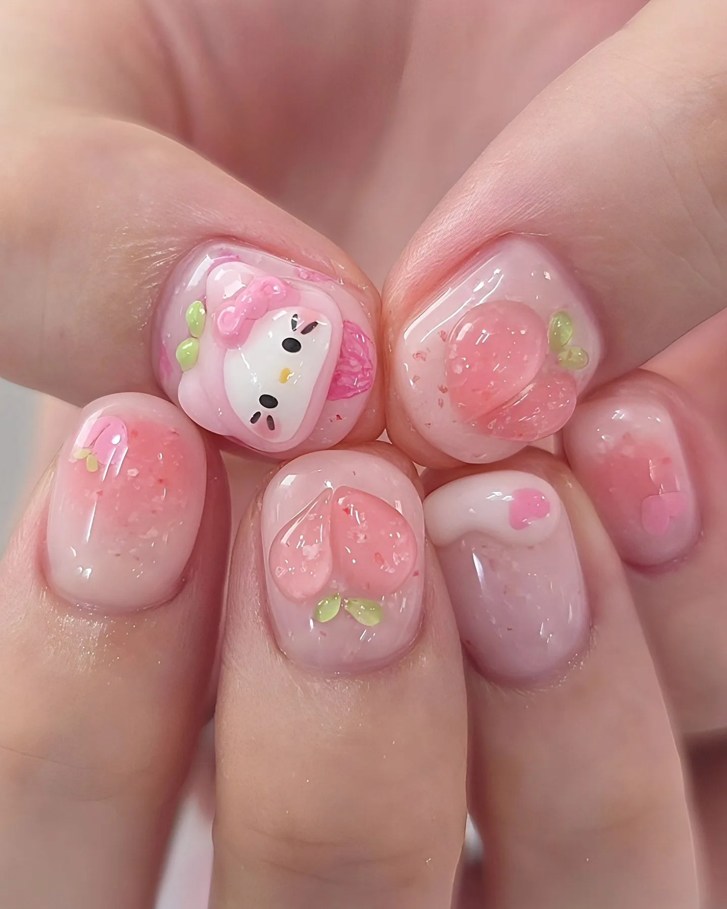 Get ready to fall in love with these adorable kawaii-inspired nails! The translucent pink jelly finish creates the perfect backdrop for that cute white character face, pink roses, and lime green leaf accents. This sweet, playful design is giving us major Japanese nail art vibes that are absolutely irresistible 🌸