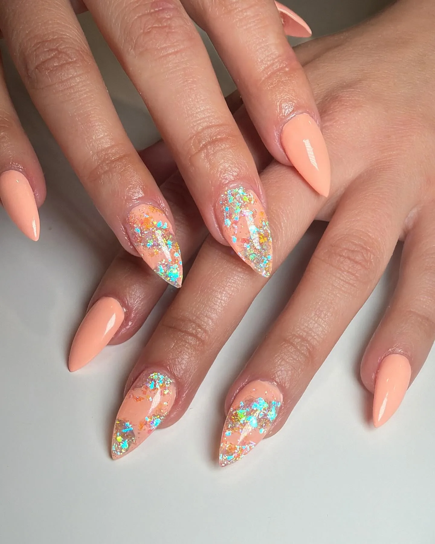 These long stiletto nails are absolutely show-stopping with their peachy-coral base and colorful confetti glitter accents! The combination of blues, greens, oranges, and golds creates such a fun, vibrant contrast against those elegant coral nails. This design perfectly balances bold statement glitter with sophisticated solid color 🎉
