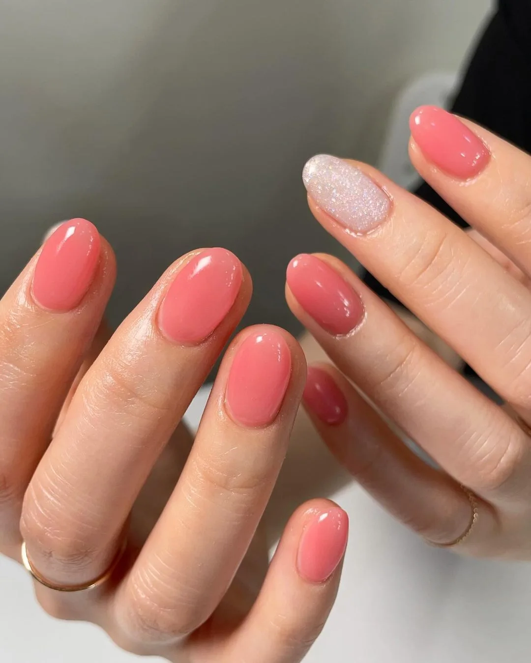 This elegant manicure features nine gorgeous coral-pink nails with one stunning accent nail that steals the show! The shimmery lavender ring finger with fine glitter creates the perfect pop of color contrast. These medium-length oval nails prove that sometimes the most subtle accents make the biggest impact ✨